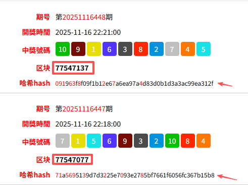哈希赛车B说明: 系统会依据波场(TRON)公链上每3秒一条的区块哈希值,先省略掉前面16位后从左往右读取10位不重复数字,其中0代表10,做为开奖结果。 1 若数字只够抓取9个,则所缺少的数字䃼充在最后做为第10名球号。 2 若出现数字只够抓取8个,则从左往右认字母代替,做为第9名球号,a代表1,6。b代表7,2。c代表3,8。d代表9,4。e代表5,10。然后再以所缺少的数字同样䃼充在最后做为第10名球号。 3 若数字罕见只够抓取7位,则按照第二条的方式,从左往右取两个字母代替,依次作为第8、9名球号,两个字母取完后,第10名自动补齐。 4 若出现数字只够抓取6位及以下,或所需字母不足则该期取消,不开奖。 5 每天固定读取北京时间早7:01整的区块哈希值为第一期开奖结果,后每180秒读取开出下一期(如公链罕见出现不是3秒一条,为避免争议,系统最终还是以180秒最接近的下一条数值为下期开奖依据),次日北京时间早4:01为最后一期,全天420期。全年365天不休息。 Q1、什么是区块哈希值(Block hash)? 区块哈希值是一段数据的DNA,每个区块哈希值都是唯一的、随机的,且不可篡改。 点击查看哈希值介绍(https://baike.baidu.com/item/Hash/390310) Q2、什么是区块链? 区块链从本质上来讲,它是一个共享数据库,存储于其中的数据或信息,具有不可伪造、全程留痕、可以追溯、公开透明、集体维护等特征。 点击查看区块链介绍 (https://baike.baidu.com/item/%E5%8C%BA%E5%9D%97%E9%93%BE/13465666) Q3、如何在链上验证开奖结果? 1、通过点击红色箭头位置的区块哈希值,可以直接跳转至波长浏览器,对比两者数据是否一致; 2、或手动打开波长浏览器(https://tronscan.org),在网页最上方的搜索框输入下图方框中的数值,点击搜索后,在搜索框下方第三行出现的“Block Hash”数值,即为对应的本期开奖结果的区块哈希。![]()